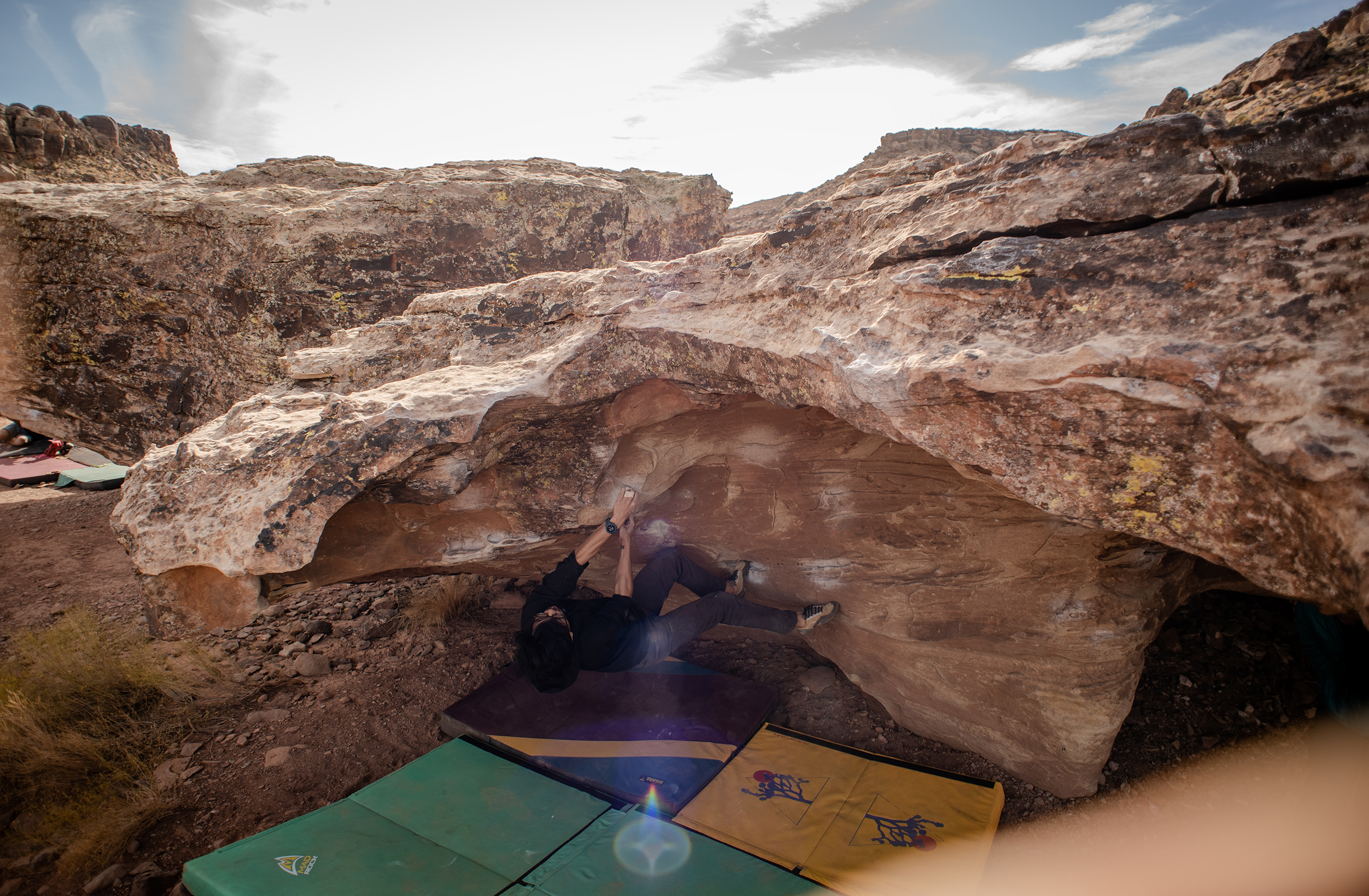 I decided to drive up to nevada this week to explore red rocks. The first day I explored the Kraft area for about 6 hours. I arrived around 1230 and it was still pretty warm out (mid 90’s) – luckily quite a few of the rocks had a variety of north facing routes that were shaded in the afternoon. I was there until sunset and became very familiar with the area completing most of the v0-v2 on the rocks. Took it easy as I was going to be there for a few days; my skin was not ready. I realized I lost a lot of strength in not climbing for the past 6 months. The self photos were timed interval shots.