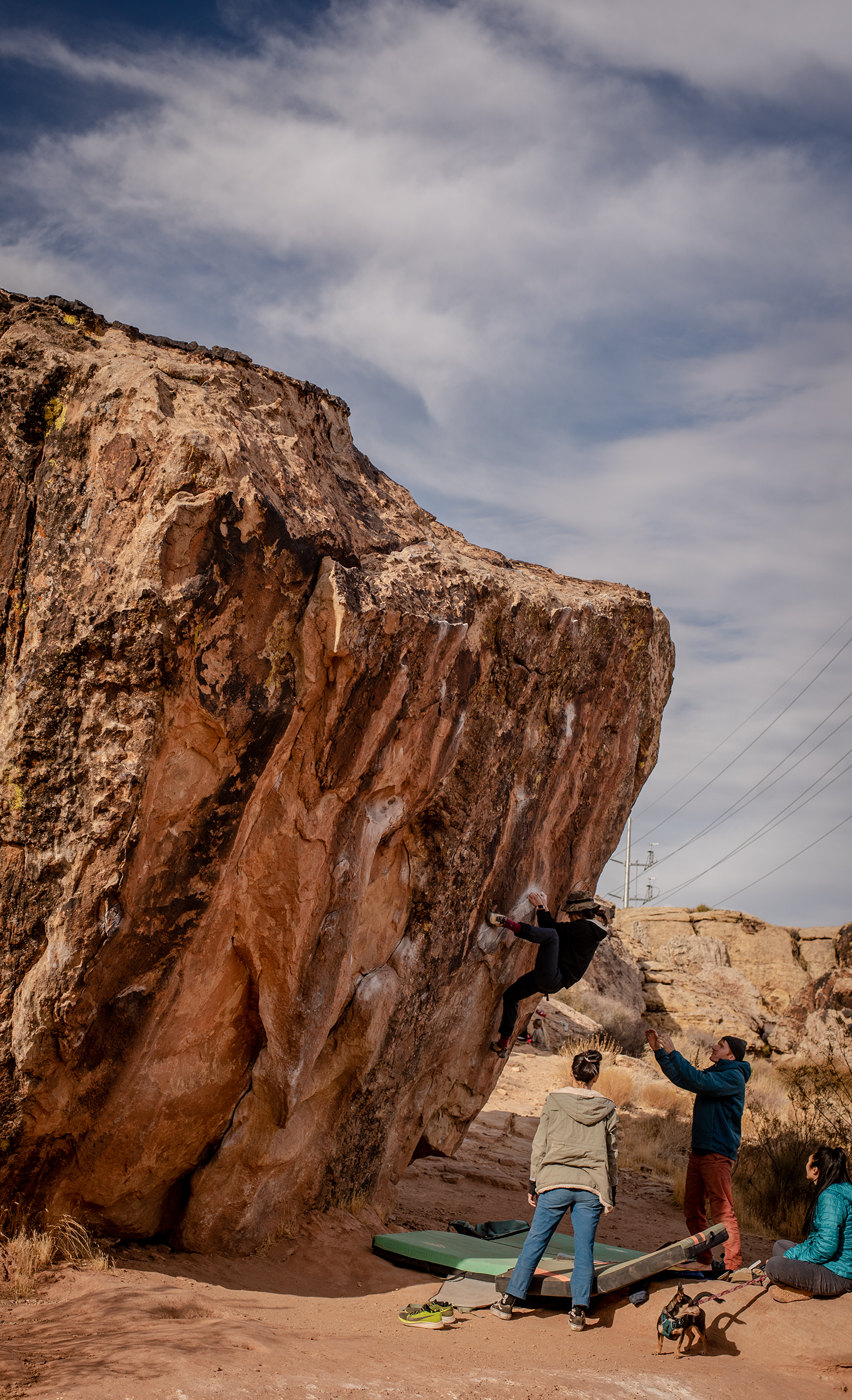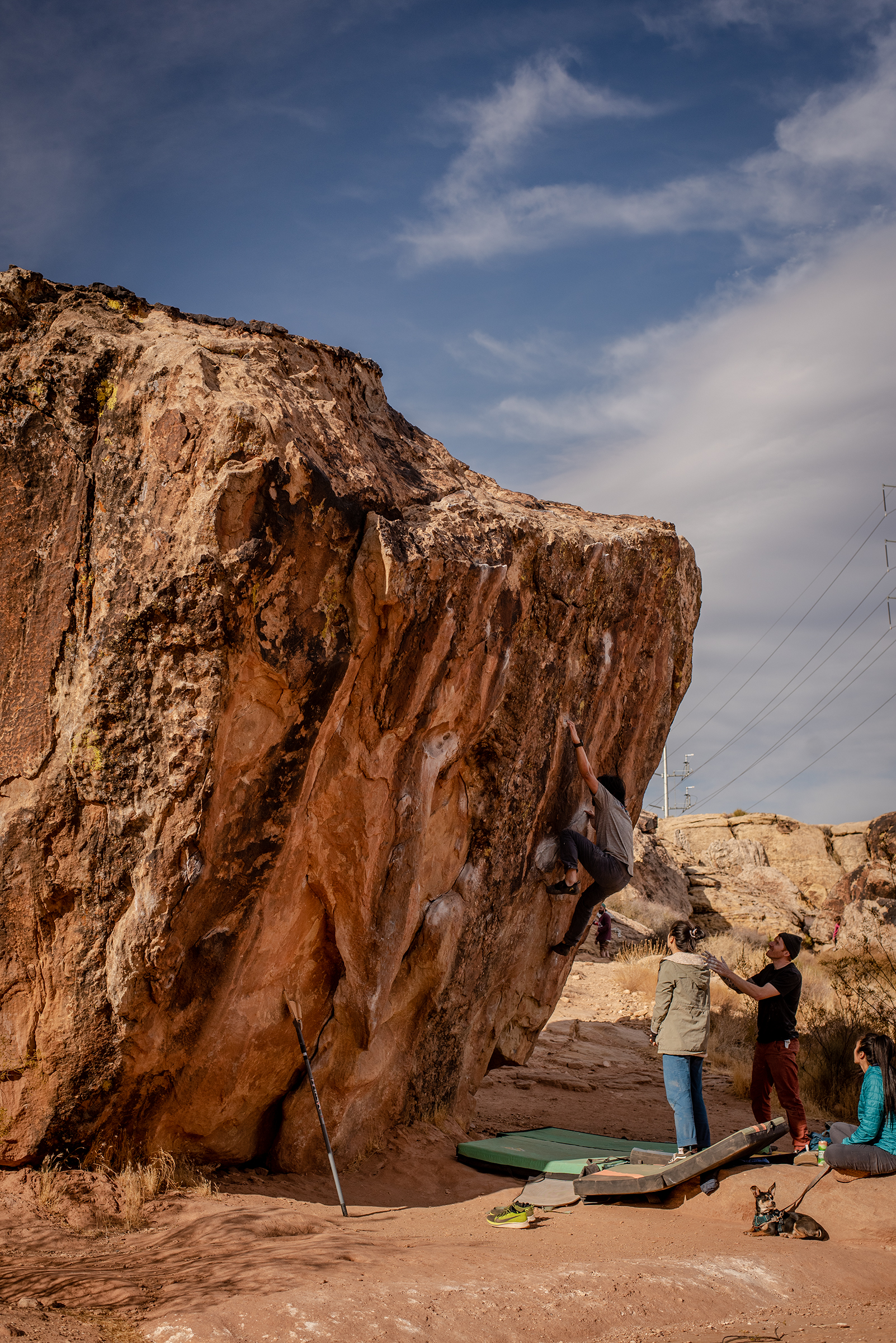 I decided late Saturday night to drive over to Red Rocks to send Pork Chop and attempt Tied To The Whipping Post (V6) after seeing Amanda’s beta. I ended up sleeping off of some road outside Baker because I was so tired. I woke up late, around 9am, and drove the rest of the way to the Kraft Mountain trailhead. I warmed up on some rocks along the path, got to Gateway Canyon, and sent Pork Chop on my second attempt; not sure why, but I was feeling strong. Strange because I slept so poorly and was super tired. On the way back to Kraft, I met up with a couple visiting from Colorado (Craig and Kelsey), and a few other locals. We took turns on TTTWP for a few hours until around 530PM I figured I should start heading back.